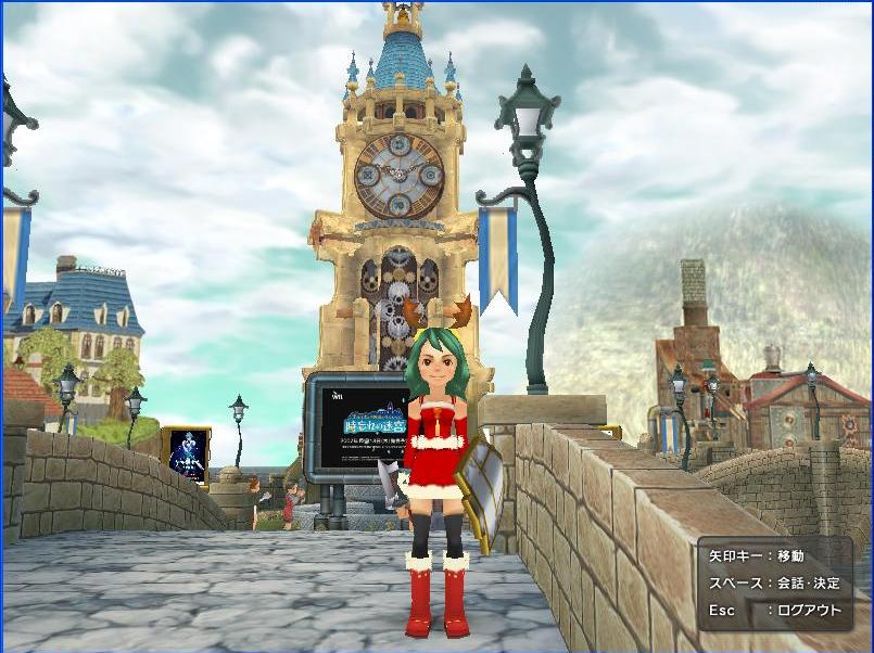 さすが、■Eだ。絵はきれいだ。まずは、メンバーズのアバターに、トナカイカチューシャがポイントのクリスマス用コスチュームを着せて、時計台前で記念撮影!街の中をグルグル歩いて、NPCに話しかけたり、そこのモニターで「チョコボの不思議なダンジョン 時忘れの迷宮」のPVを見るだけなんだけど、なんだか楽しいよ。